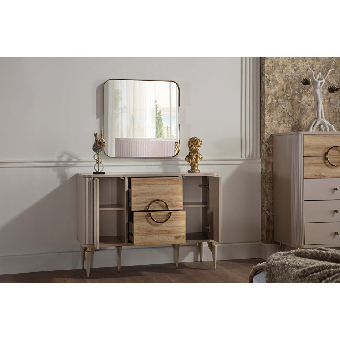 Туалетный столик Санвито SANV-23 один из элементов турецкой коллекции SANVITO. Прекрасное дополнение интерьера спальни, гостиной, залы. Столик обладает сравнительно небольшими размерами 1,170 мм x 470 мм x 830 мм. Может использоваться как дамский столик или как комод. Имеет два больших вместительных выдвижных ящика по центру, и полки для хранения за дверцами фасадов. Кремовый оттенок фасадов, наряду с рифленой поверхностью комбинируется с древесной фактурой ящичков. Оригинальный дизайн и теплые, нежные тона в сочетании с функциональностью столика-комода Санвито SANV-23 делают его изящным и привлекательным.